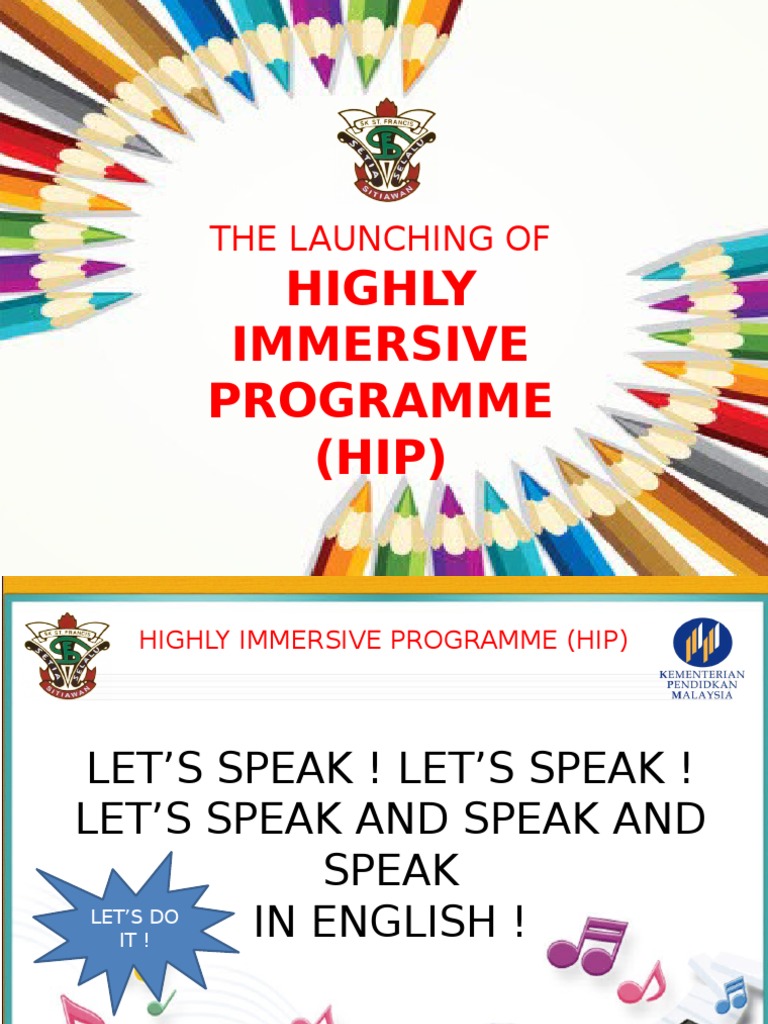 Speech by yang berhormat dr. Highly immersive programme (hip) an afternoon with the minister of education. To provide a platform for teachers to learn english from community and organizations with good english. Hip highly immersive programme auld lang syne cover by christine beltran. Cefr & highly immersive programme (hip) flyers.