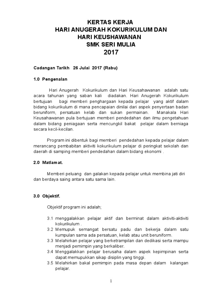 Kertas kerja salon kecantikan 3. Sekolah kebangsaan kelibang 07000 kuah, langkawi kedah darul aman kertas konsep hari keusahawanan muda eskaykay 2017 tarikh : Pelajar jke semester 6 melaksanakan hari keusahawanan mereka dengan membuka beberapa gerai makanan mengikut kreativiti mereka serta bekerja sebagai satu kumpulan. Selaras dengan falsafah pendidikan kebangsaan bagi melahirkan insan yang seimbang dari projek keusahawanan. Antara kertas kerja yang terdapat dalam koleksi ini seperti, kertas kerja kem bestari solat, kem cemerlang jawi, bulan kemerdekaan, hari keusahawanan, kertas kerja minggu bahasa dan banyak lagi.